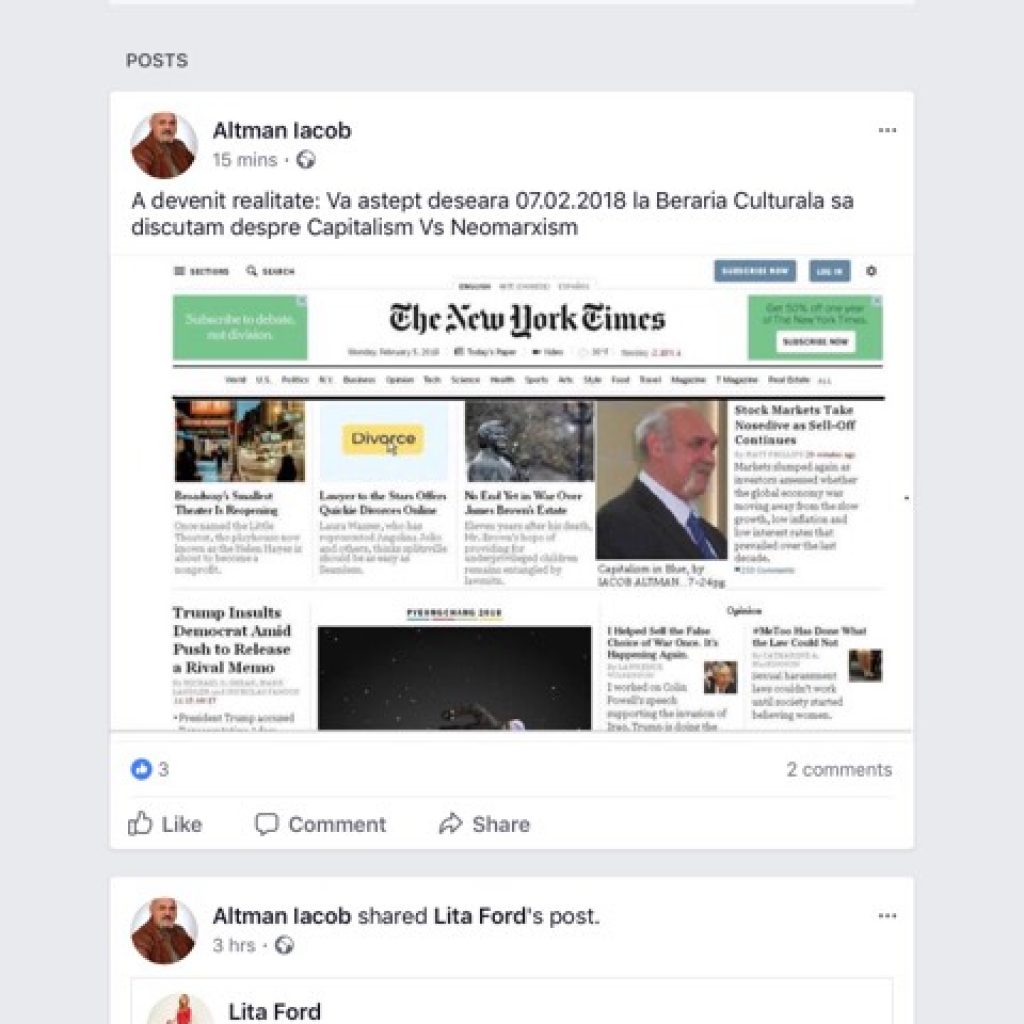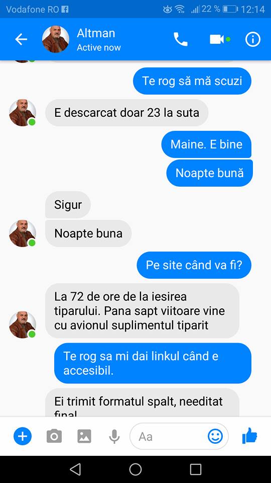 Ei bine, tot joi, în privat l-am contactat, ca să posteze articolul. După cinci ceasuri de tăcere, deși a văzut mesajul trimis pe Messenger-ul Facebook, i-am adresat public cererea lui Altman de a posta articolul, întrucât cele 72 de ore au trecut. A răspuns cu o altă manipulare, postând o nouă făcătură mincinoasă, cum că are contract de drepturi de autor și nu-l poate încălca.